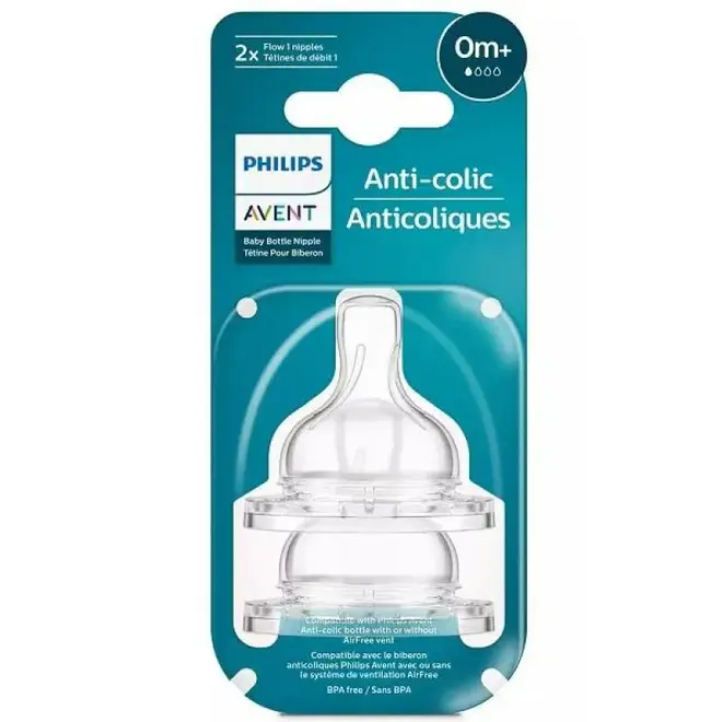 A embalagem contém 2 unidades do bico Philips Avent Anti-Cólica Nº1, ideal para uso contínuo ou como reposição.