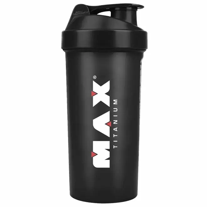 Coqueteleira Max Titanium Preta 700ml: design funcional, marcações para dosagem precisa, tampa com vedação segura, ideal para shakes e suplementos.