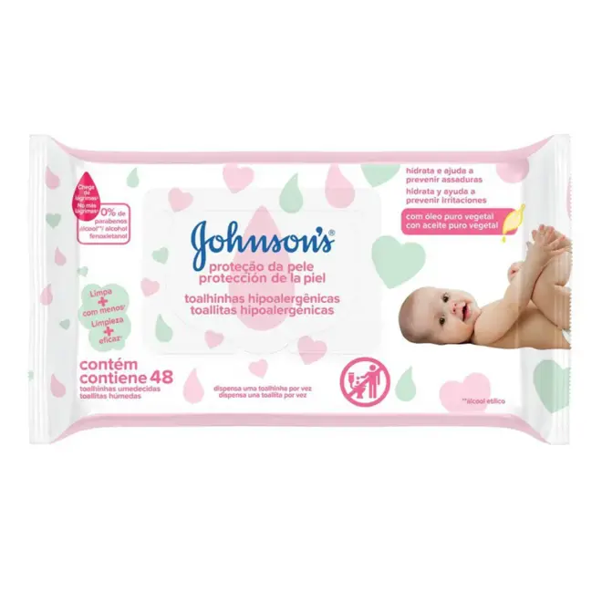 Os Lenços Umedecidos Johnson's Baby Proteção da Pele são toalhinhas hipoalergênicas que podem ser utilizadas para a limpeza de todo o corpo do bebê, até mesmo o rosto. Sem arder os olhos, a partir da tecnologia Chega de Lágrimas, as toalhas são enriquecidas com loção hidratante e óleo vegetal puro, que previne irritações e assaduras, deixando a pele do bebê hidratada e preservando as barreiras cutâneas naturais.